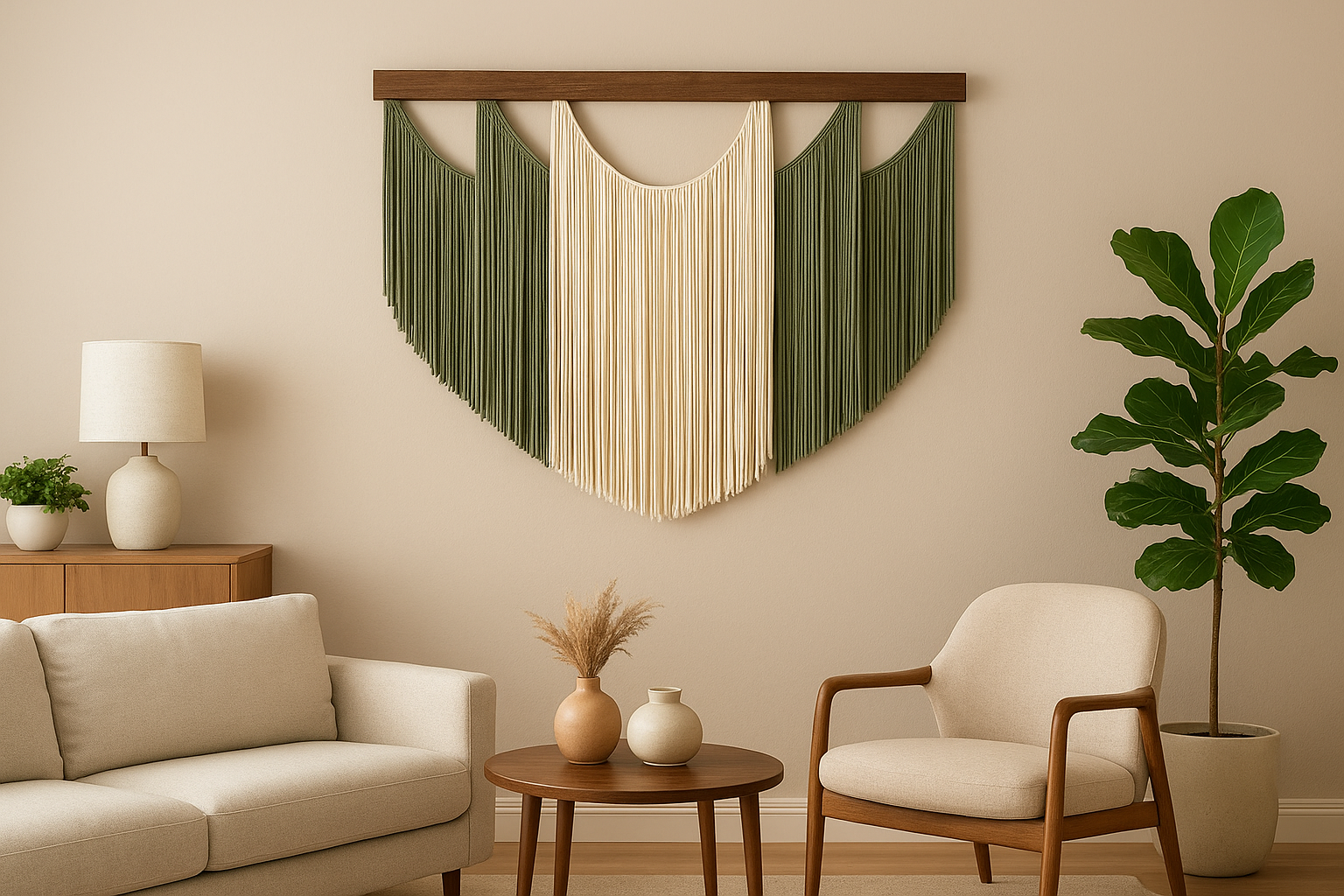 Enhance your home decor with this elegant handmade wall hanging that beautifully combines modern design with a natural aesthetic. Crafted with high-quality cotton cords in gradient tones of green and white, it is skillfully arranged to create a stunning layered “draped wave” effect. Mounted on a smooth wooden bar, this wall art blends effortlessly with minimalist, boho, or contemporary interiors.